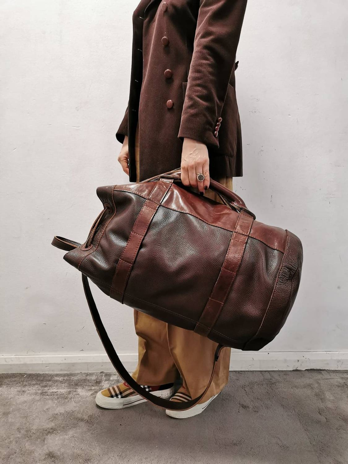 - uchwyt - rączka wykonany ze skóry naturalnej jest produktem vintage i upcykling i ma blisko 60 lat (wybity rocznik produkcji 1968 od spodniej strony wraz z informacją o polskim miejscu produkcji w zakładzie kaletniczym),