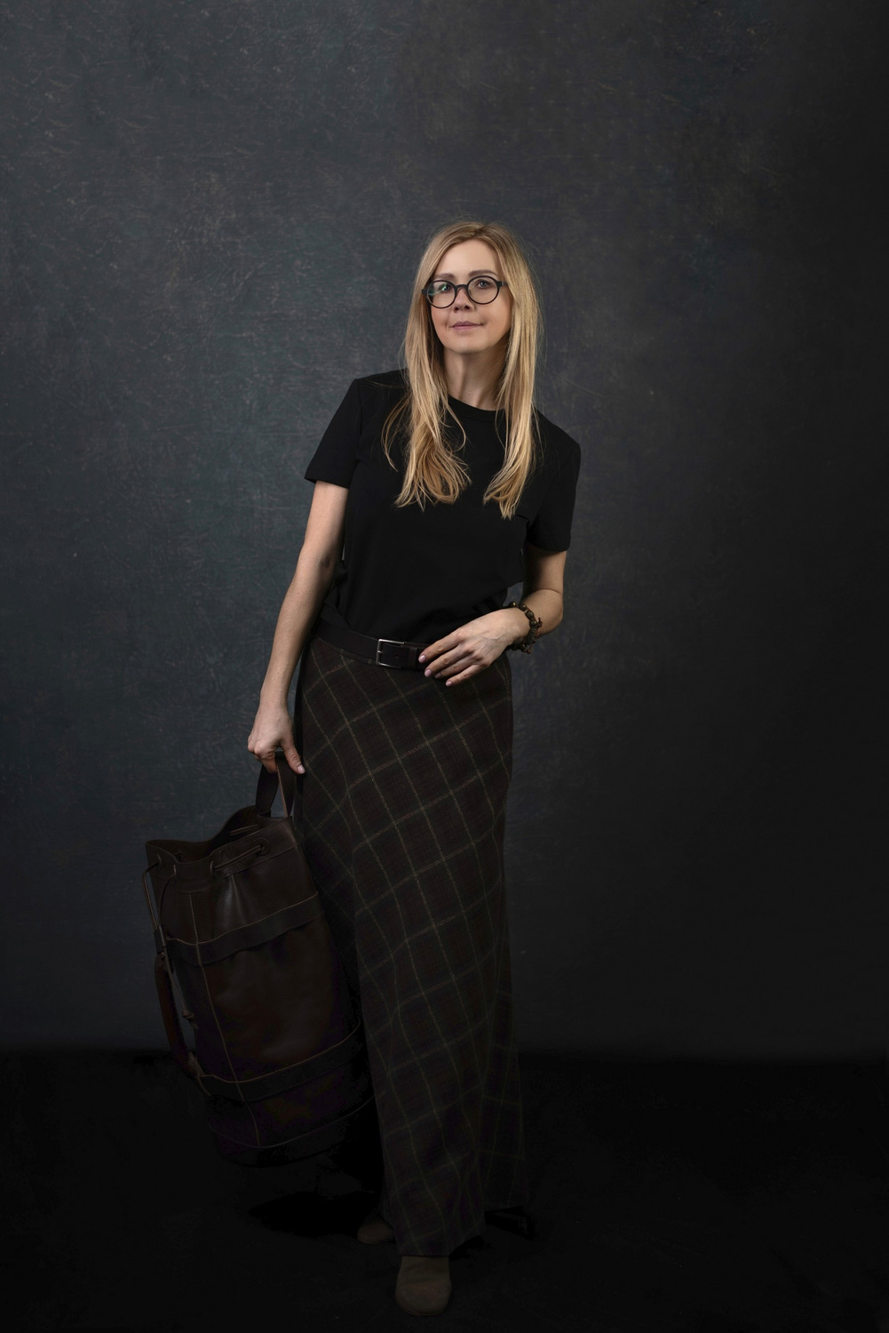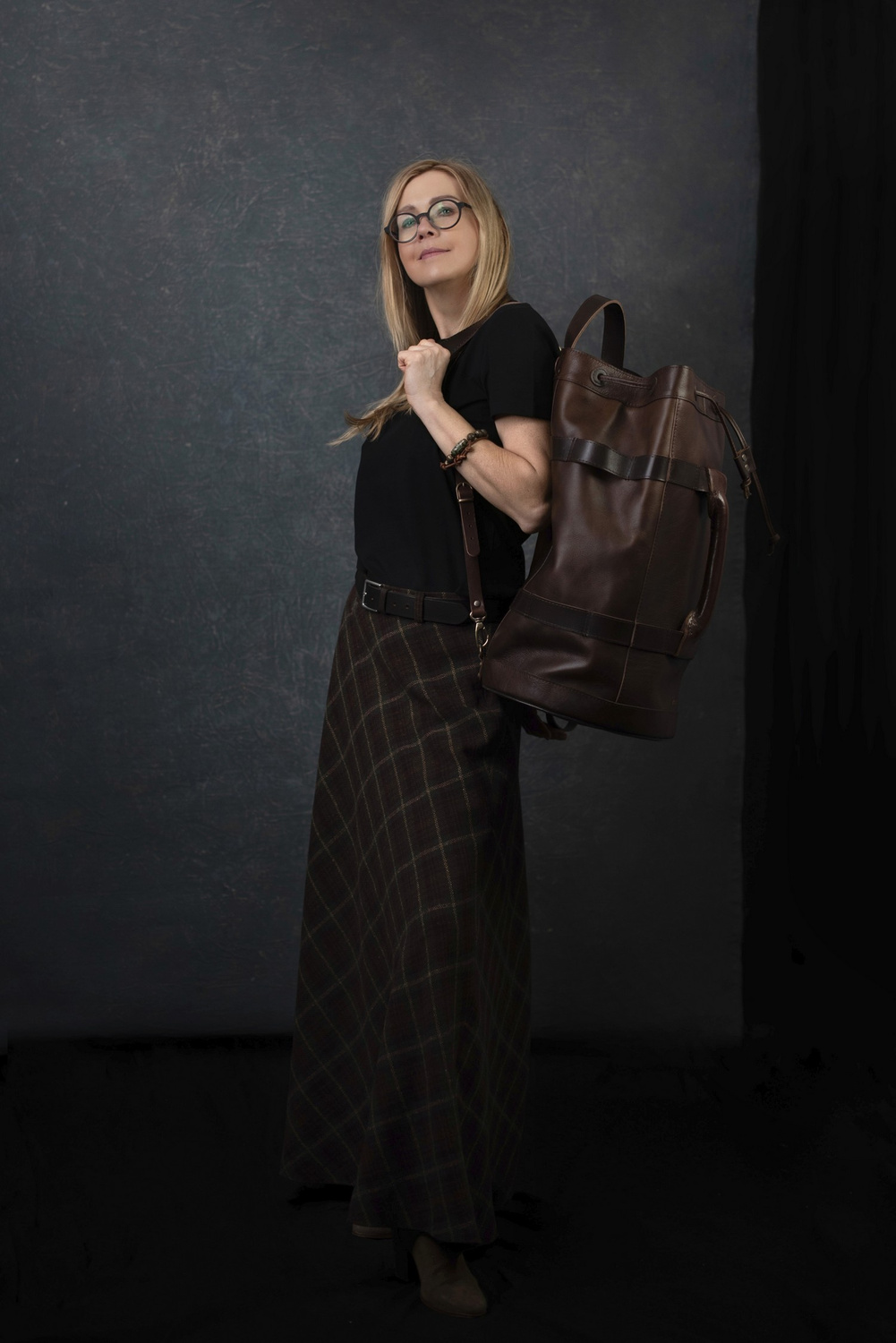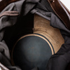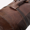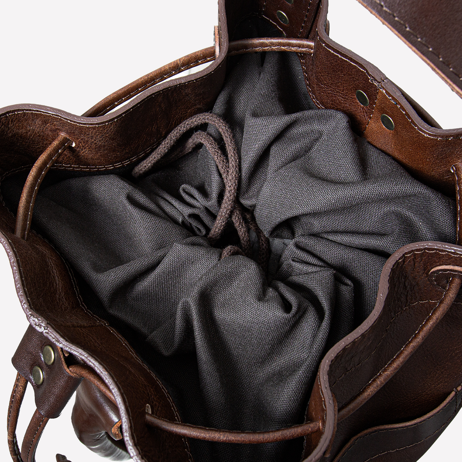 Worek szyty z trzech rodzajów grubej skóry naturalnej barwionej roślinnie w kolorze brązu Skóry pochodzą w większości z polskich garbarni, niektóre elementy w torbach szyte są ze skór z włoskich garbarni.