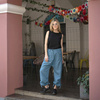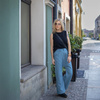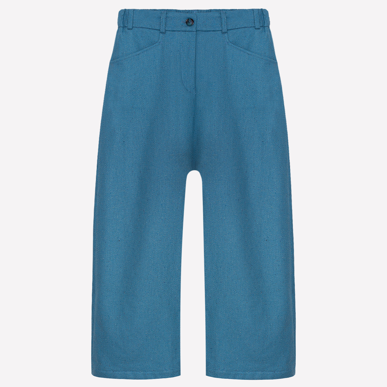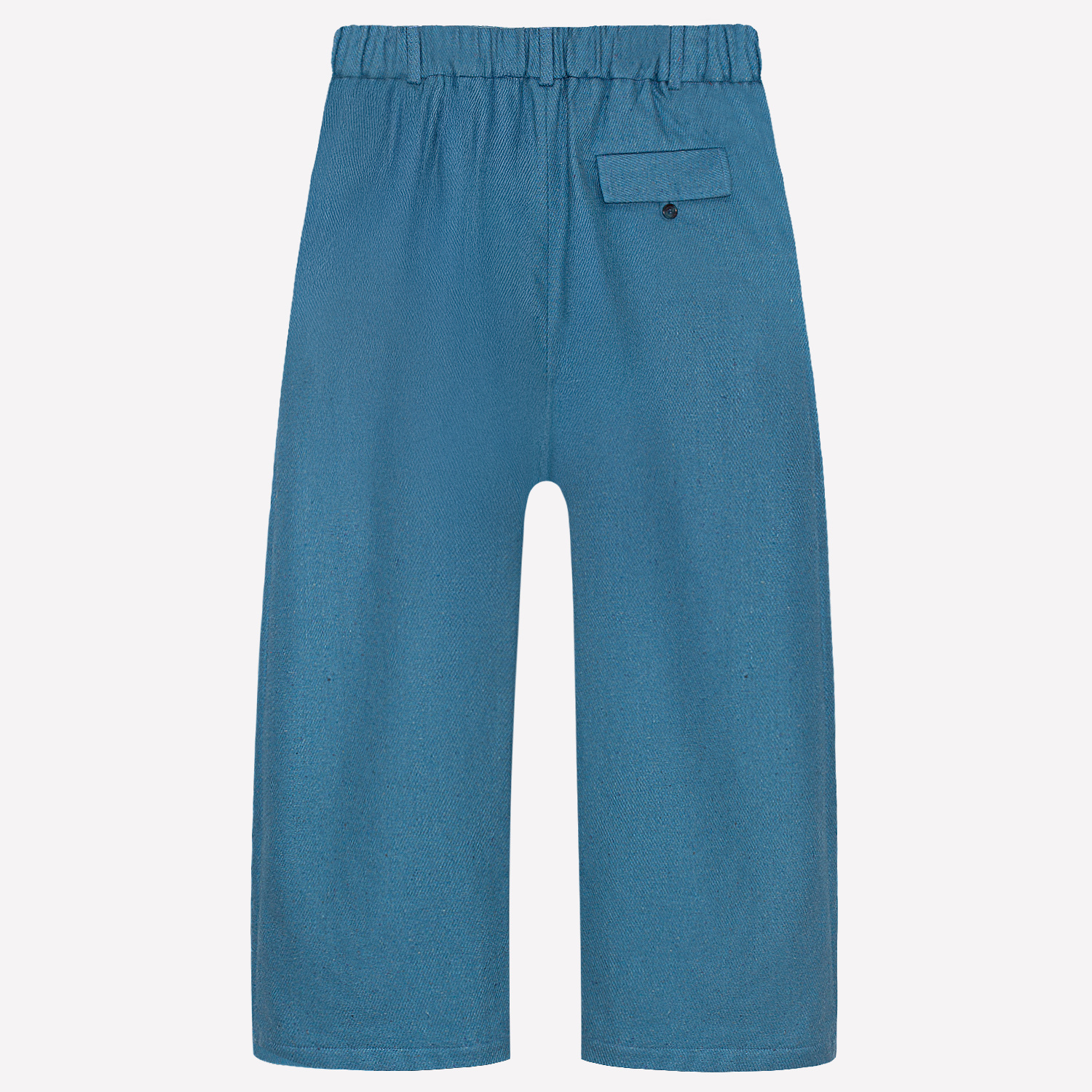 Spodnie z denimu na całej powierzchni tkaniny mają wzory z typowymi monogramami znanej marki. Spodnie uszyte są z oryginalnej, deadstockowej tkaniny marki maxmara. W tym fasonie tkanina została wykorzystana w sposób przewrotny i zabawny. Spodnie świetnie wyglądają z marynarką, t-shirtem, koszulą czy swetrem.