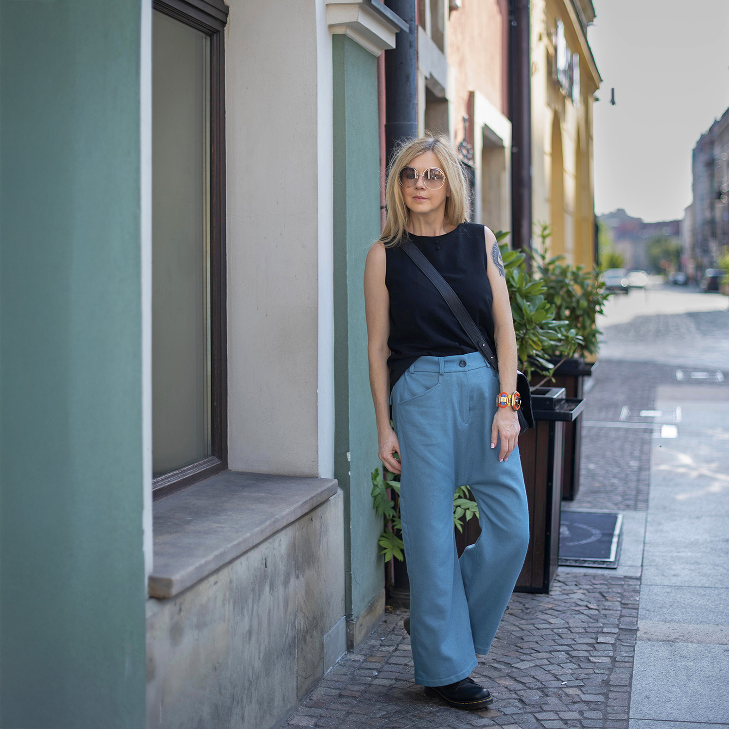 Aby zwiększyć uniwersalność spodni zastosowane rozwiązanie z bocznymi paseczkami z tej samej tkaniny. Paski te można związać u dołu nogawek co spowoduje fantazyjne zwężenie nogawki. W ten sposób nogawki można nosić proste, puszczone, szersze jak i zwężone, upięte paskami. Rozwiązanie to powoduje, że jeden model spodni wygląda jak dwa zupełnie inne modele. Związane nogawki są fajnym rozwiązaniem przy noszeniu ciężkich butów, kozaków czy butów sportowych. Paseczki można łatwo samodzielnie wyciąć, gdyby ta dodatkowa funkcja okazała się dla Klientki zbędna.