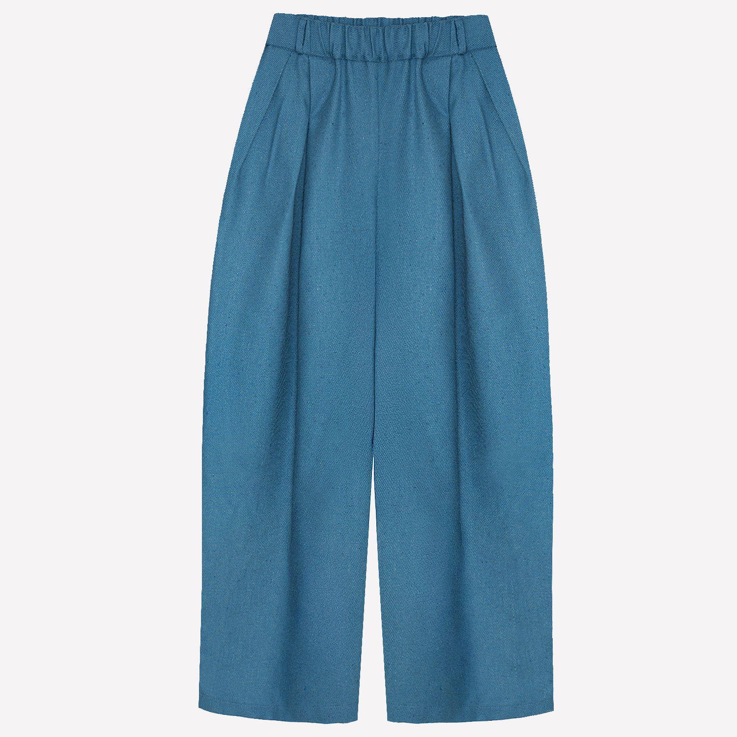 Spodnie z matowej, włoskiej, naturalnej, ekologicznej tkaniny premium z efektem surowości w kolorze intensywnym błękitnym.