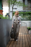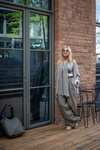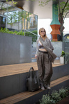 Spodnie mają dopracowaną konstrukcję - są szerokie i tkaniny jest dużo, jednak dzięki głębokim zakładkom w odpowiednich miejscach nie poszerzające sylwetki w biodrach. Spodnie są długie, aby można było je ewentualnie skrócić wg własnych preferencji. Spodnie mają boczne kieszenie, wszytą gumę miejscami marszczoną aby były uniwersalne dla Pań szczupłych i nieco tęższych. Pas może być obniżony lub wysoki, w zależności od preferencji.