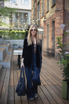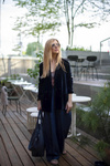 Spodnie mają dopracowaną konstrukcję - są szerokie i tkaniny jest dużo, jednak dzięki głębokim zakładkom w odpowiednich miejscach nie poszerzające sylwetki w biodrach. Spodnie są długie, aby można było je ewentualnie skrócić wg własnych preferencji. Spodnie mają boczne kieszenie, wszytą gumę miejscami marszczoną aby były uniwersalne dla Pań szczupłych i nieco tęższych. Pas może być obniżony lub wysoki, w zależności od preferencji.