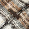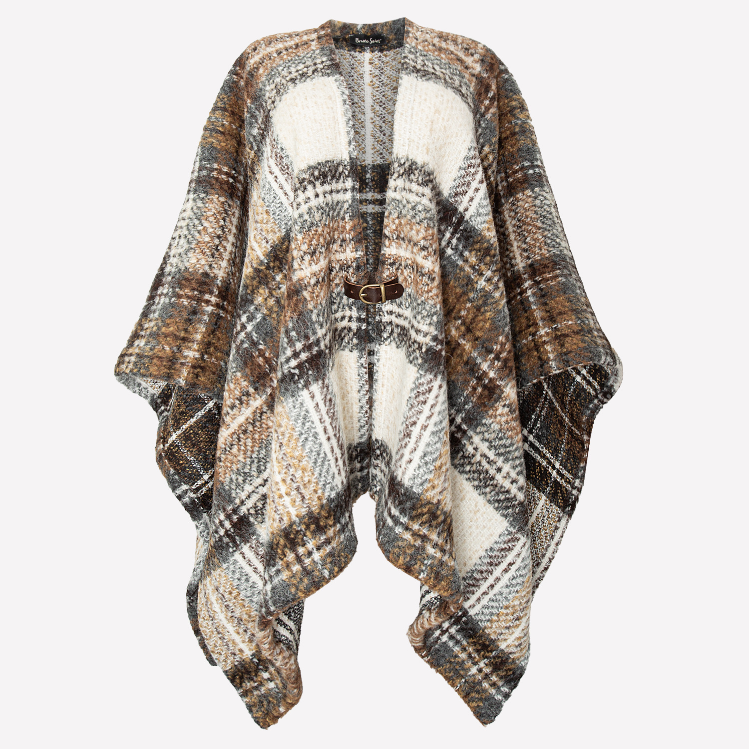 Poncho zapinane jest na pasek ze skóry naturalnej w kolorze brązowym z wytoczonym logotypem Bruno Saint.