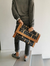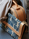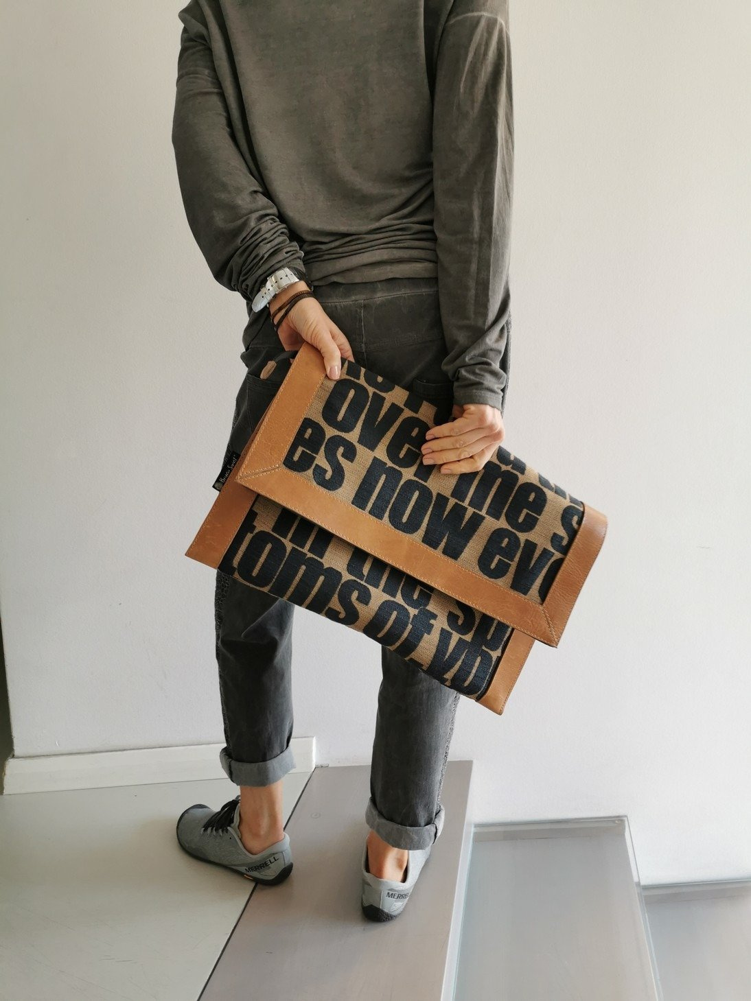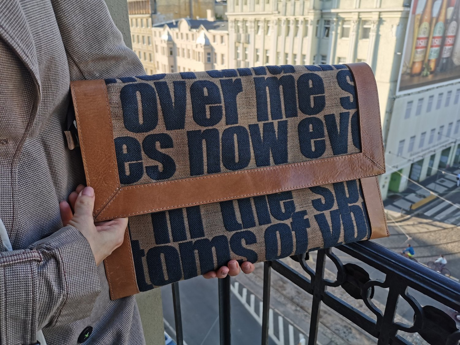 Dużych rozmiarów kopertówka pełniąca funkcję aktówki, czy torby na laptopa. Wykonana z grubej, delikatnej, włoskiej tkaniny w kolorze błękit pruski, na bazie lnu i jedwabiu z z certyfikatem oeko-tex, potwierdzającym bezpieczeństwo dla człowieka i środowiska, testowanej w dziedzinie ekologii, tekstyliów i skóry. Wykończona piękną skórą barwioną roślinnie. Torby szyte są ręcznie przez polskich rzemieślników w pojedynczych egzemplarzach. Wnętrze korpusu z estetycznie dobraną bawełnianą tkaniną, dużą wewnętrzną kieszenią zapinaną na zamek. Torba zapinana na magnesy.